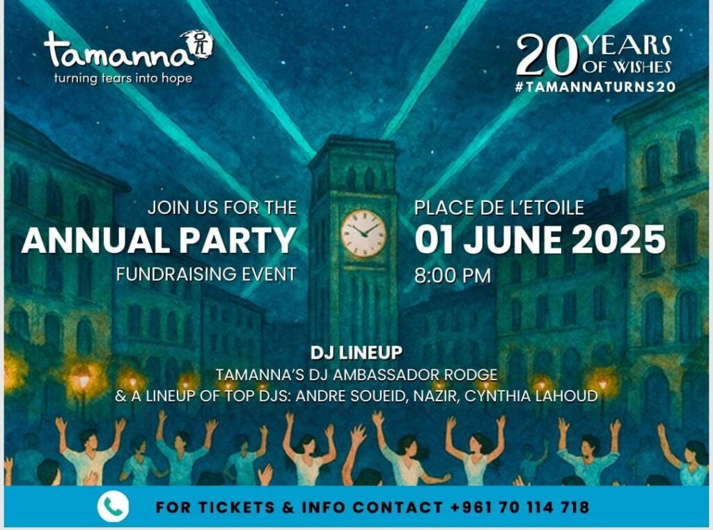 تحتفل جمعية “تمنى”، وهي جمعية لبنانية تُعنى بتحقيق الأمنيات للأطفال المصابين بأمراض مستعصية، بالذكرى العشرين لتأسيسها من خلال عشاء أبيض ساحر يُقام مساء الأول من حزيران 2025 في ساحة النجمة – شارع المعرض، في قلب وسط بيروت التاريخي.