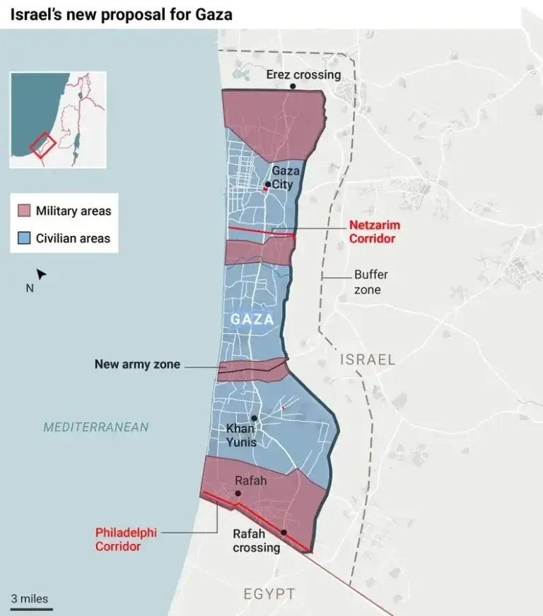 وتُظهر الخريطة، التي سربها دبلوماسيون مطلعون على تفاصيل المقترح وحصلت عليها صحيفة “صنداي تايمز” البريطانية، مناطق عسكرية مطوقة ومخصصة فقط للقوات الإسرائيلية في شمال ووسط وجنوب غزة، تفصل بين مناطق مدنية.