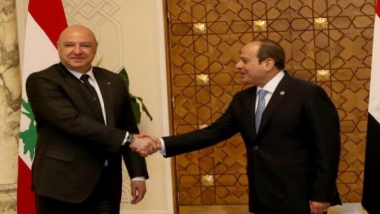 واستقبل السيسي نظيره اللبناني، في القاهرة، الاثنين، في إطار زيارة «تستهدف تعزيز العلاقات الثنائية، لا سيما في المجالات الاقتصادية، والبنية التحتية، والطاقة، وجهود إعادة الإعمار، واستعادة السلم والأمن الإقليمي في تحديات كبيرة تواجه المنطقة»، حسب إفادة رسمية للمتحدث باسم الرئاسة المصرية.