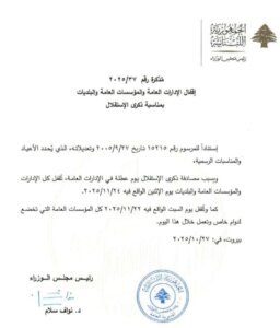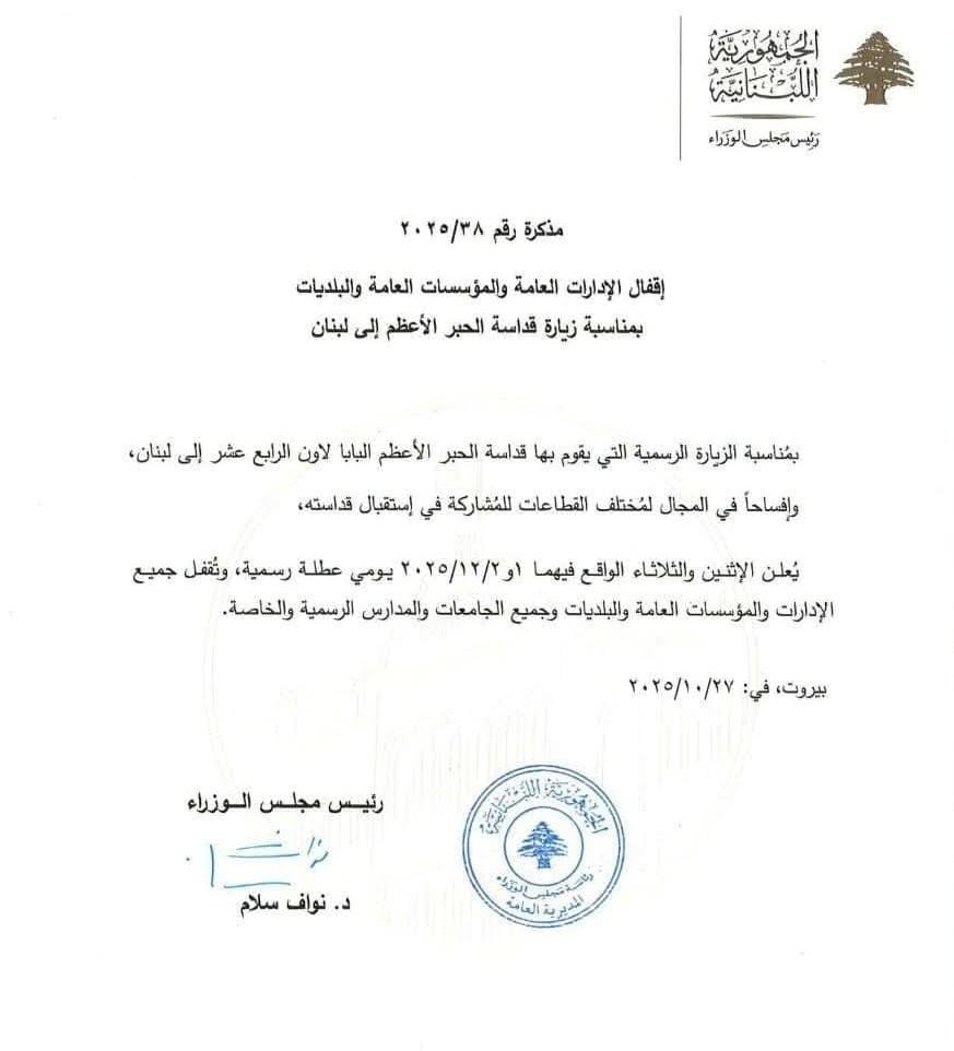 أصدر رئيس مجلس الوزراء نواف سلام، مذكرة بإقفال الادارات العامة والمؤسسات العامة والبلديات، بمناسبة زيارة قداسة الحبر الاعظم إلى لبنان.