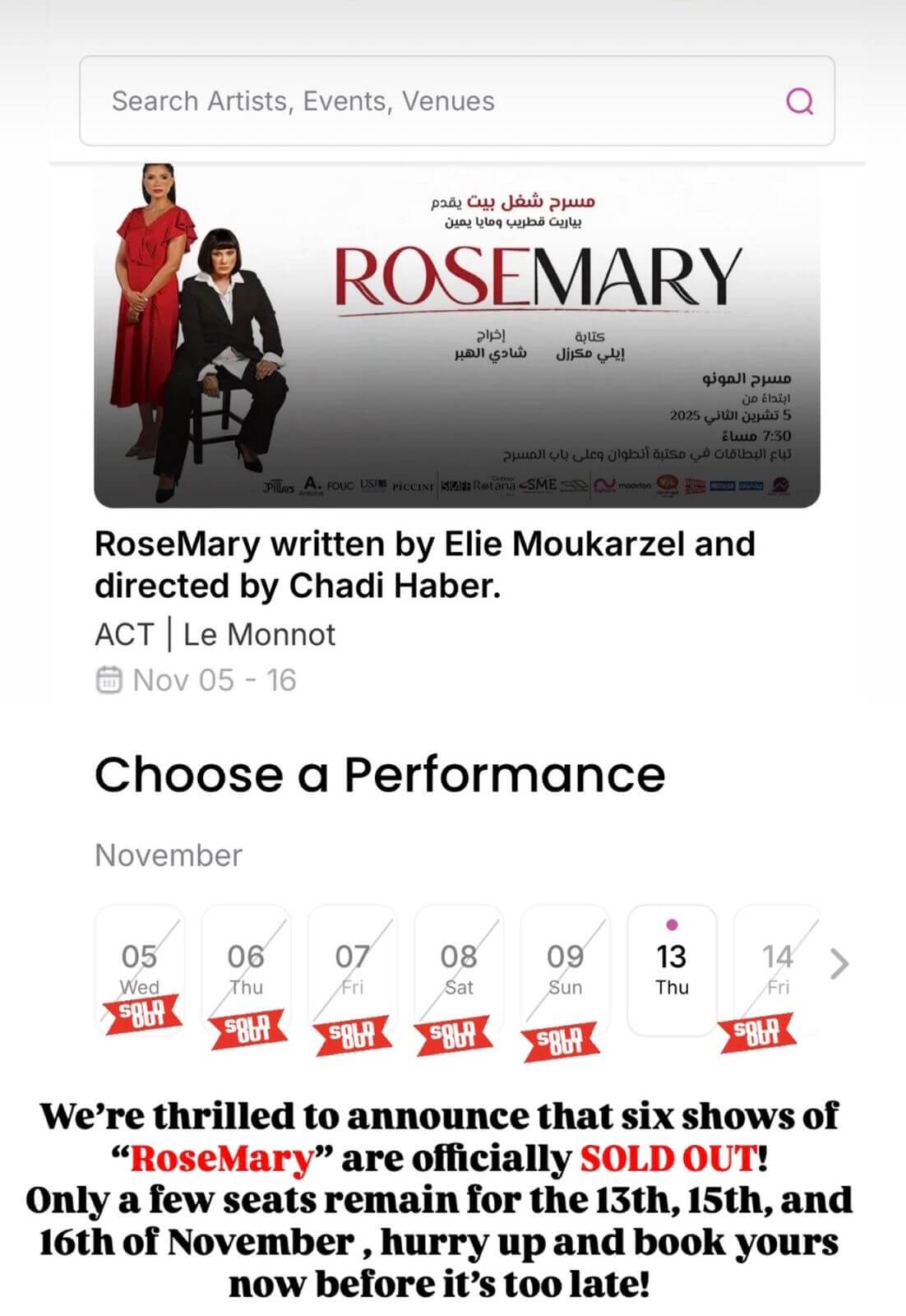 قبل رفع الستار بأيام معدودة، سجّلت مسرحية «روزماري» إنجازاً مميزاً بنفاد بطاقات عروضها الستة الأولى بالكامل، لتُعلن جميعها “سولد آوت” قبل العرض الافتتاحي، في دليل واضح على الحماس الكبير والترقّب الذي يرافق هذا العمل المسرحي المنتظر.