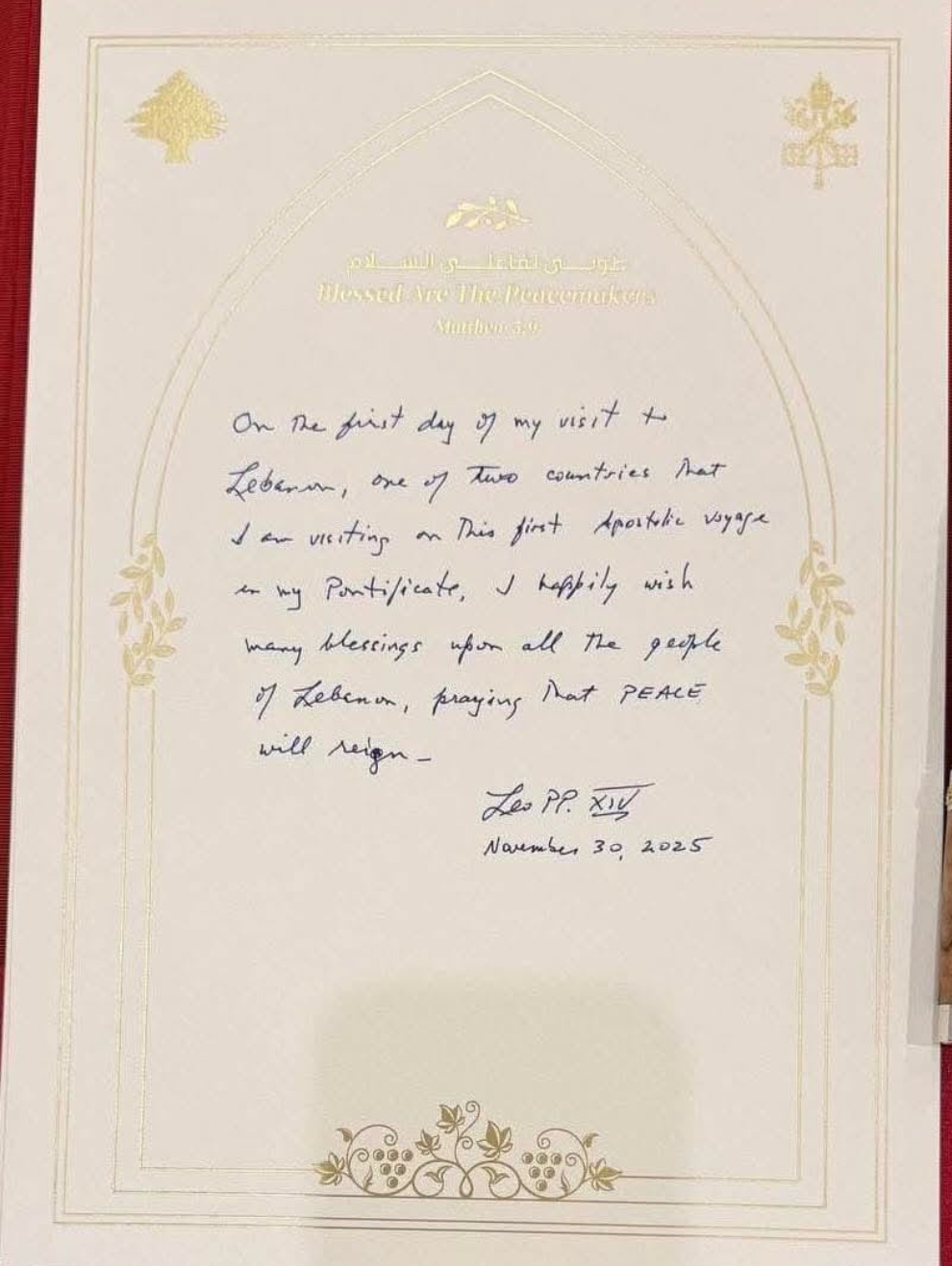 كتب البابا لاون الرابع عشر في السجل الذهبي في قصر بعيدا متوجهاً الى اللبنانيين: ” في اليوم الأول في زيارتي الى لبنان, أحد البلدين الذين زرتهما في زيارتي الرسمية الاولى التي قمت بها بعد تولي منصبي، اتمنى للبنانيين، بفرح، الكثير من النعم، مصاباً من أجل أن يعم السلام في المنطقة”.