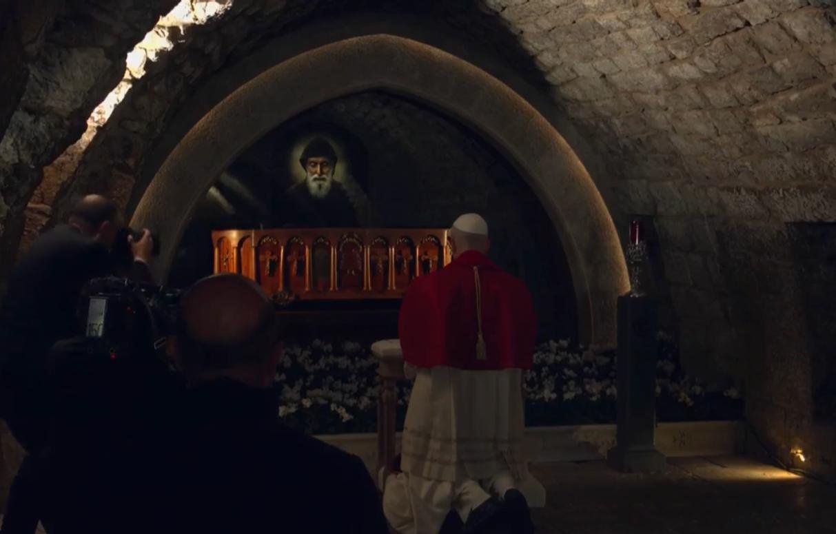 يجول البابا لاوون الرابع عشر داخل دير عنايا وسط الترانيم المقدّسة التي ملأت المكان، قبل أن يدخل إلى ضريح القديس شربل حيث ركع بخشوع وصلى داخل القبر. وفي لحظة رمزية مؤثرة، أضاء البابا شمعة كان قد حملها معه من روما خصيصًا لهذه الزيارة، ووضعها أمام الضريح كهدية لدير مار مارون – عنايا.