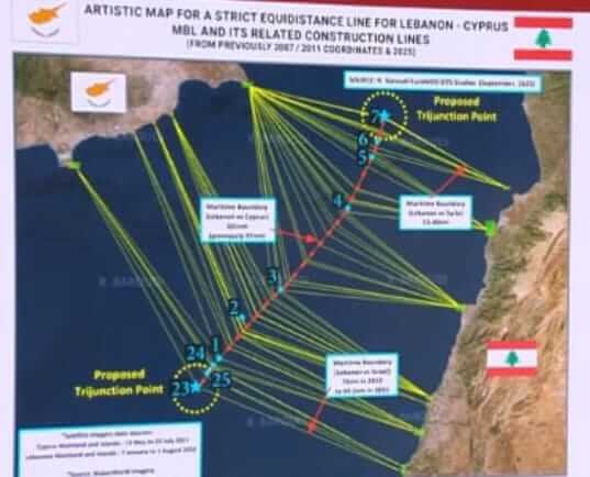 كما تُظهر الخريطة اعتماداً على الأقمار الصناعية، أن “خط الحدود البحرية مرسوم بوضوح بين البلدين”. فهو يعطي أفضلية واضحة للبنان الذي كسب، وفق بارودي، حوالي 10200 متر من الجهة الغربية، مقابل حوالي 2760 متراً لصالح قبرص.