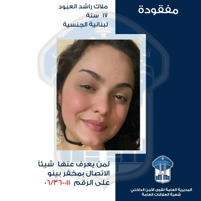 وأضاف البلاغ، “التي غادرت بتاريخ 14-12-2025، منزل والدتها الكائن في بلدة عكّار العتيقة ولم تَعُد حتى تاريخه، علمًا أنها ليست المرّة الأولى التي تُغادر مكان إقامتها”.