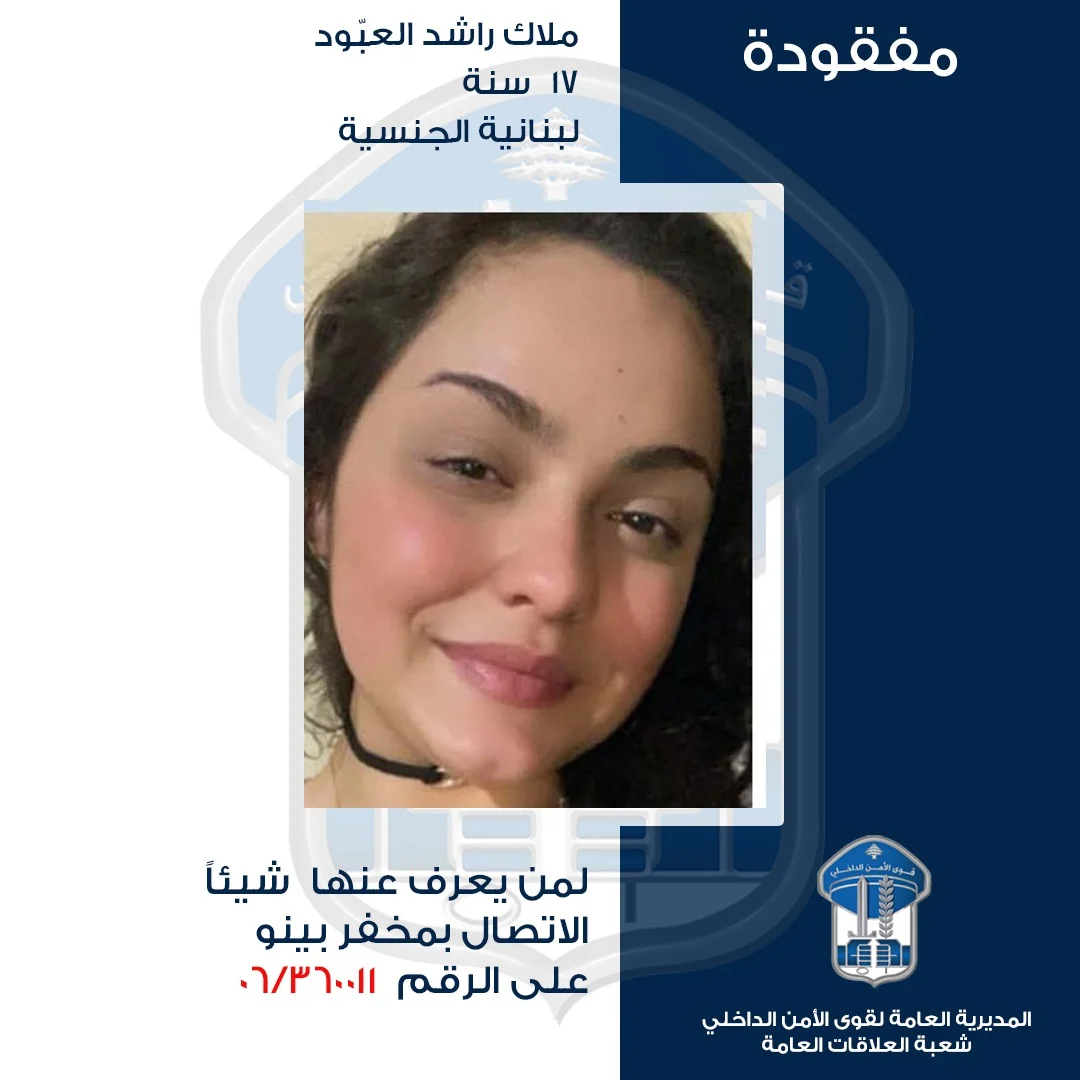 صدر عن المديريّة العامّة لقوى الأمن الدّاخلي ـ شعبة العلاقات العامّة بلاغ جاء فيه: ” تُعمِّم المديريّة العامّة لقوى الأمن الدّاخلي بناءً على إشارة القضاء المختص، صورة القاصر المفقودة ملاك راشد العبّود (مواليد عام 2008، لبنانيّة)”.