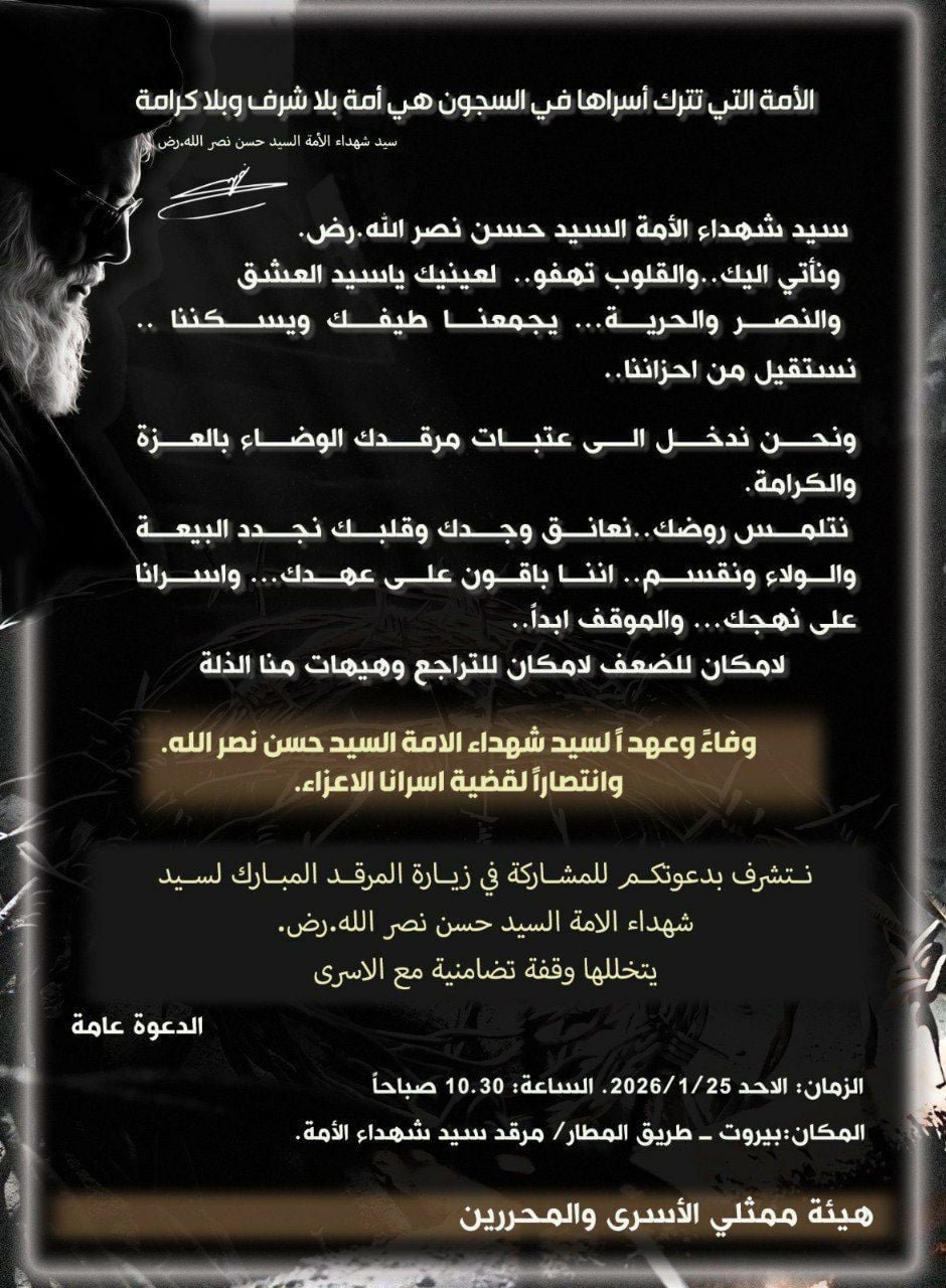 وجاء في الدعوة، التي حملت شعار “وفاءً وعهدًا لسيد شهداء الأمة السيد حسن نصر الله، وانتصارًا لقضية أسرانا الأعزاء”، أنّ الزيارة ستُقام يوم الأحد 25/1/2026 عند الساعة 10:30 صباحًا.