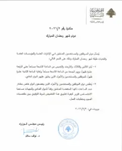 أعلنت رئاسة الحكومة تعديل دوام الموظفين والمستخدمين العاملين في الإدارات العامة والمؤسسات العامة والبلديات طيلة شهر رمضان المبارك وذلك على النحو التالي: