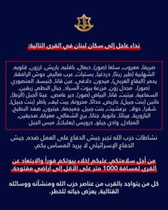 إلى سكان لبنان الذين أخلوا منازلهم الليلة الماضية حفاظًا على سلامتهم: غارات جيش الدفاع مستمرة فمن أجل سلامتكم وسلامة أبناء عائلاتكم – لا تعودوا إلى منازلكم