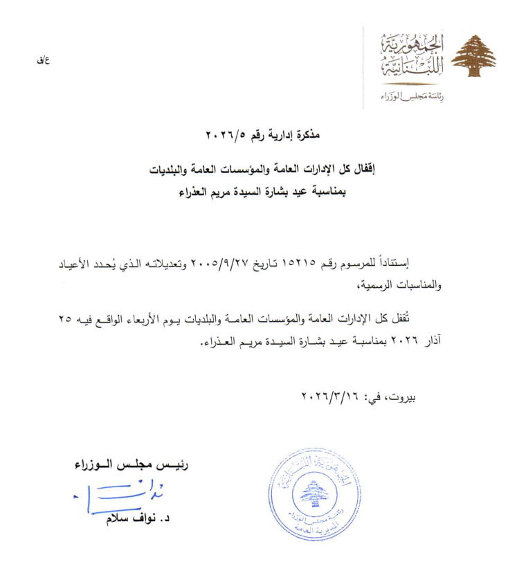 أصدرت رئاسة مجلس الوزراء مذكرتين إداريتين تقضيان بإقفال جميع الإدارات العامة والمؤسسات العامة والبلديات لمناسبة عيد الفطر المبارك وعيد بشارة السيدة مريم.