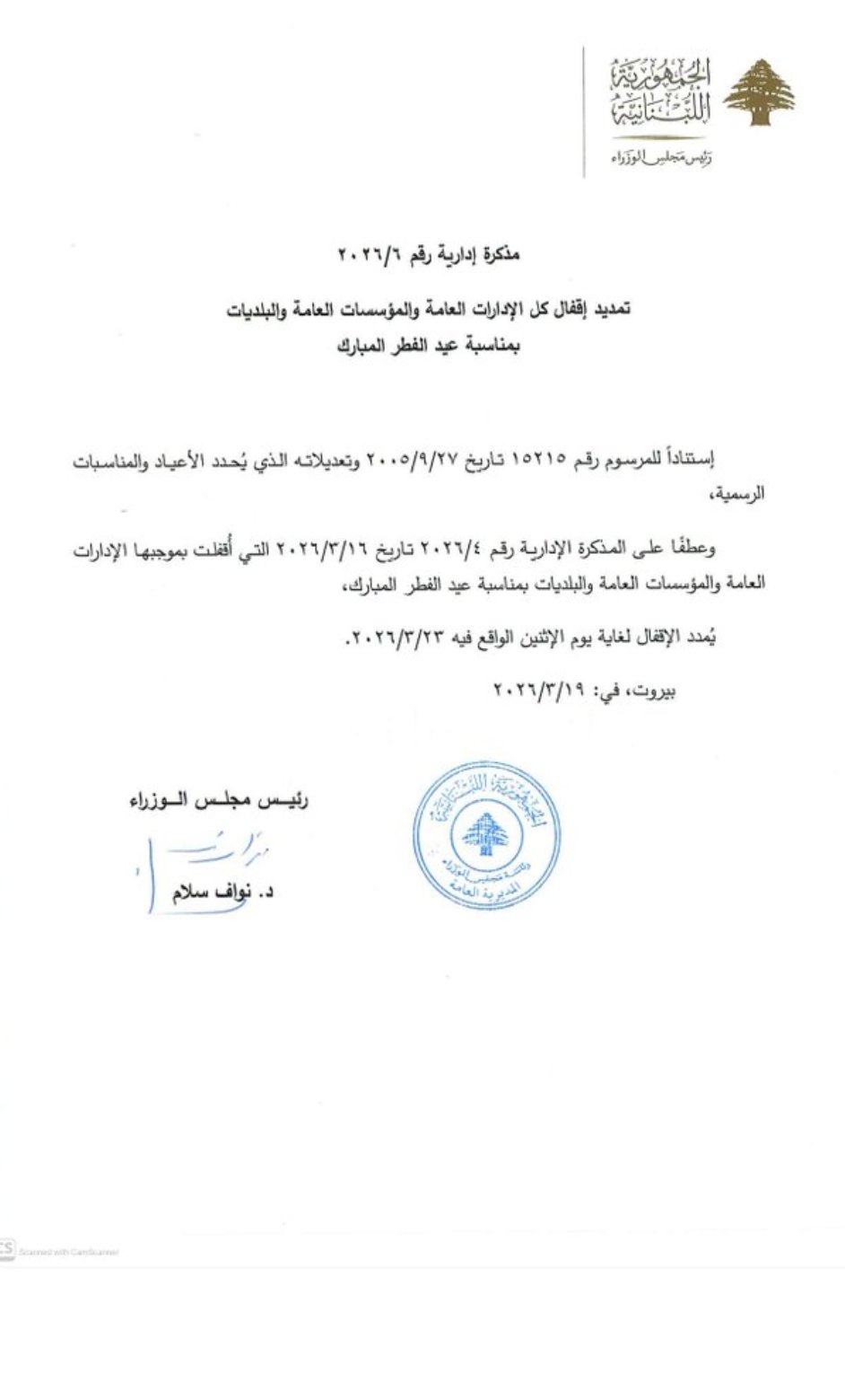 أعلن مجلس الوزراء أنه استناداً للمرسوم رقم 15215 تاريخ 27/9/2005 وتعديلاته الذي يُحدد الأعياد والمناسبات الرسمية، وعطفاً على المذكرة الإدارية رقم 4/2026 تاريخ 16/3/2026 التي أقفلت بموجبها الإدارات العامة والمؤسسات العامة والبلديات بمناسبة عيد الفطر المبارك، يُمدد الإقفال لغاية يوم الإثنين الواقع فيه 23/3/2026.