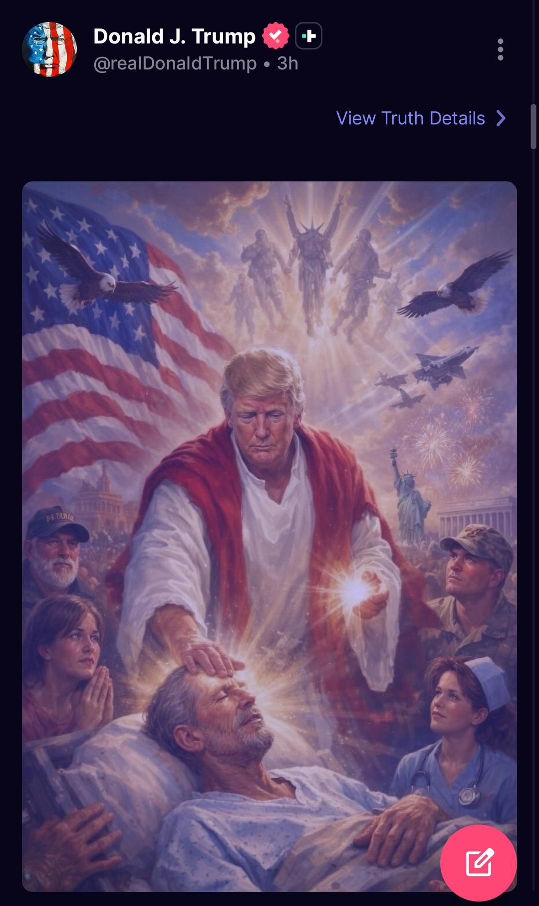 أثار الرئيس الأميركي دونالد ترامب موجة واسعة من الجدل، بعد نشره صورة على حسابه الخاص ظهر فيها بمظهر يحمل إيحاءات بتشبيه نفسه بالسيد المسيح، في مشهد تضمن دلالات دينية واضحة.