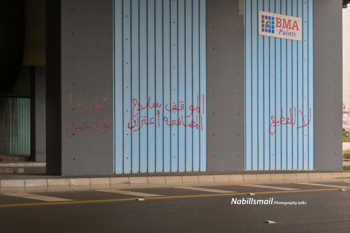 وتُظهر الصور كتابات رُسمت بألوان مختلفة على جدران الطرقات العامة، وتحمل عبارات حادة تتهم المسؤولين بـ”العمالة” و”التطبيع”، من بينها: