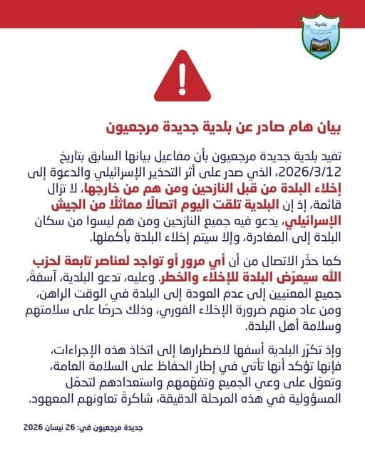 وأوضحت البلدية أن بيانها الصادر بتاريخ 12 آذار 2026، والذي جاء عقب إنذار إسرائيلي يدعو إلى إخلاء البلدة من النازحين ومن هم من خارجها، لا يزال ساري المفعول، مشيرة إلى أنها تلقت اليوم اتصالًا جديدًا يحمل المضمون نفسه.
