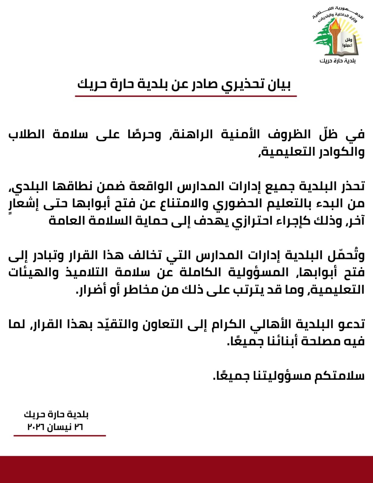 أصدرت بلدية حارة حريك بياناً تحذيرياً اليوم، 26 نيسان 2026، قررت بموجبه منع جميع إدارات المدارس الواقعة ضمن نطاقها البلدي من البدء بالتعليم الحضوري أو فتح أبوابها أمام الطلاب حتى إشعار آخر. وأوضحت البلدية أن هذا القرار يأتي كإجراء احترازي تفرضه الظروف الأمنية الراهنة، وذلك من أجل ضمان سلامة الطلاب والكوادر التعليمية وحماية السلامة العامة.