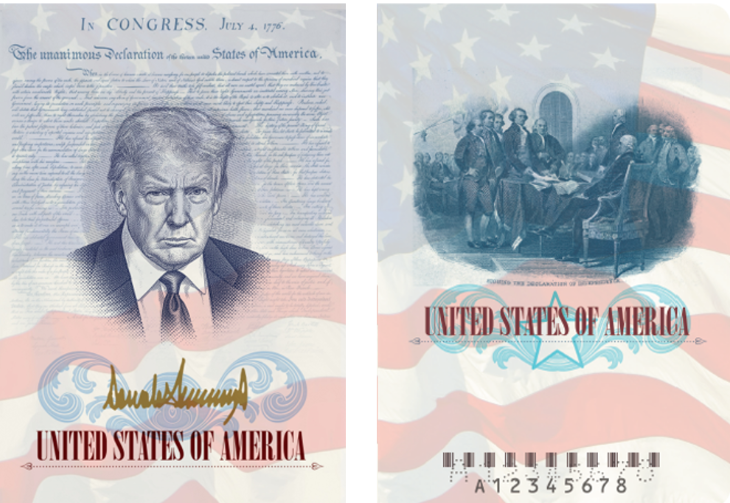 وبحسب التقرير، تتميّز التصاميم الجديدة بوجود صورة ترامب على الغلاف الداخلي، محاطة بنص إعلان الاستقلال والعلم الأميركي، إلى جانب توقيعه باللون الذهبي، فيما تتضمن صفحات أخرى اللوحة الشهيرة للآباء المؤسسين أثناء توقيع إعلان الاستقلال.